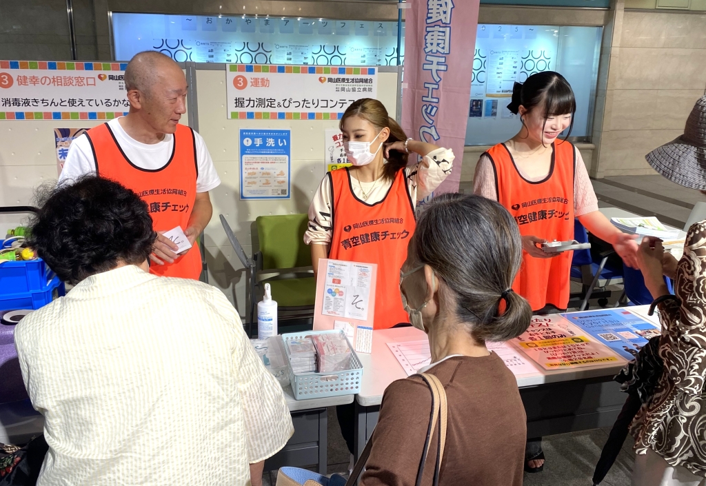 9月27日(土)、岡山市の主催するフレイル予防に関連した「気づく」「知る」「取り組む」イベント、「気になる。身になる。岡山ウエルネス」に参加しました。岡山医療生協・岡山協立病院ブースは、握力ぴったんこコンテストや手洗いおばけ(グリッターバグ)を活用し、専門職による健幸(健康)の相談窓口も設置しました。結果、200名ほど来場されました。ありがとうございます!今回はJR岡山駅地下通路の広場に開催場所が変更され、前年までの改札付近から離れましたが、「チラシをみたよ」「昨年楽しかったからまた来たよ」など声もかけていただき励みになりました。