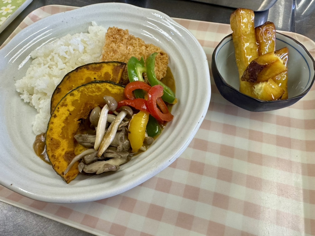今月は15日に開催しました。メニューはきのこカツカレーと大学いもでした。