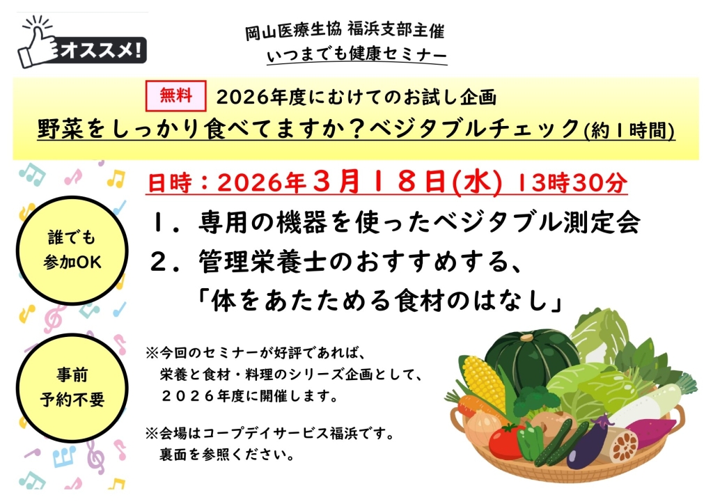 今後も、健康や生活に関するイベントを随時開催(協力含む)しています。みなさんもぜひご参加ください。今後の予定は岡山医療生協のイベントカレンダーからご確認ください。岡山医療生協の公式LINEも公開中です。いつでも片手で最新の情報を受け取ることもできます。ご登録をよろしくお願いします。