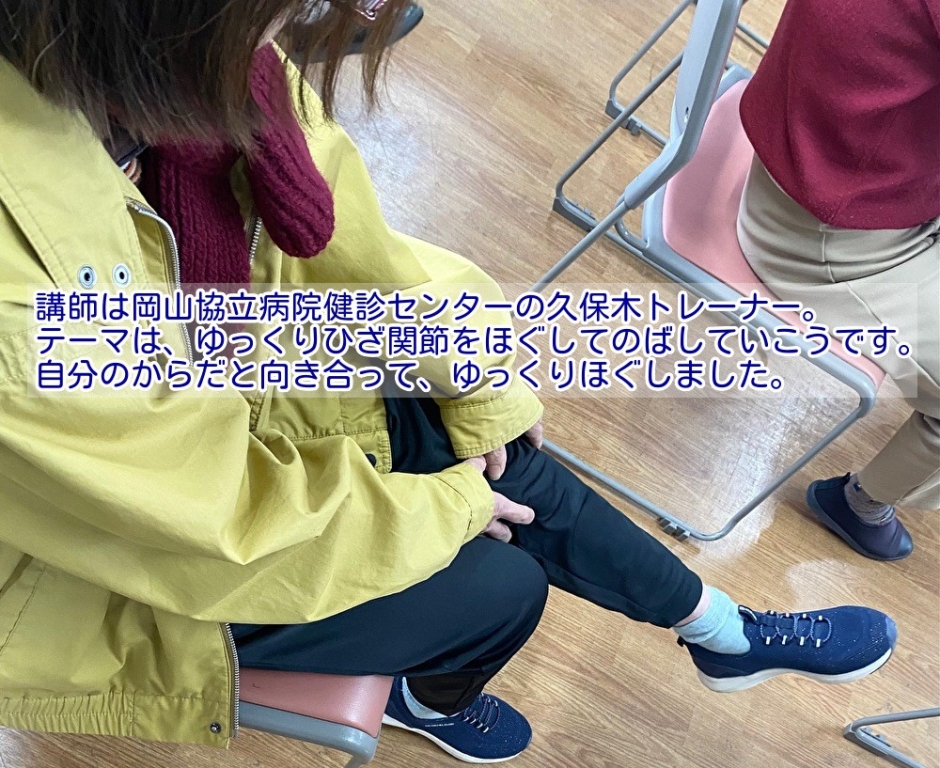 2025年11月19日(水)、南区の福浜支部で、骨から健康を考えるシリーズ~最終回~を開催しました。講師に岡山協立病院健診センターの久保木トレーナーをむかえ、今回も会場は満員となりました。参加くださった皆様、ありがとうございます。ひざ関節をゆっくりほぐし、しっかり伸ばす運動はどうでしたか?2026年も秋ごろですが、骨のシリーズ企画を予定しています。ぜひ、ご参加ください。組合員さんではなくても参加可能です。次は2026年3月にまたみんなで集まりましょう!