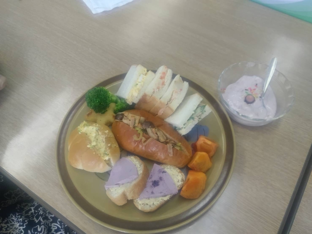 第3火曜日は、クリスマス会を開催しました。クリスマス会食プレートには、ブルーベリークリームチーズやボテト&チキン&キュウリ、ブロッコリー、星形の白身フライやフルーツ等、12人で手分けして1時間程度で出来上がりました。
