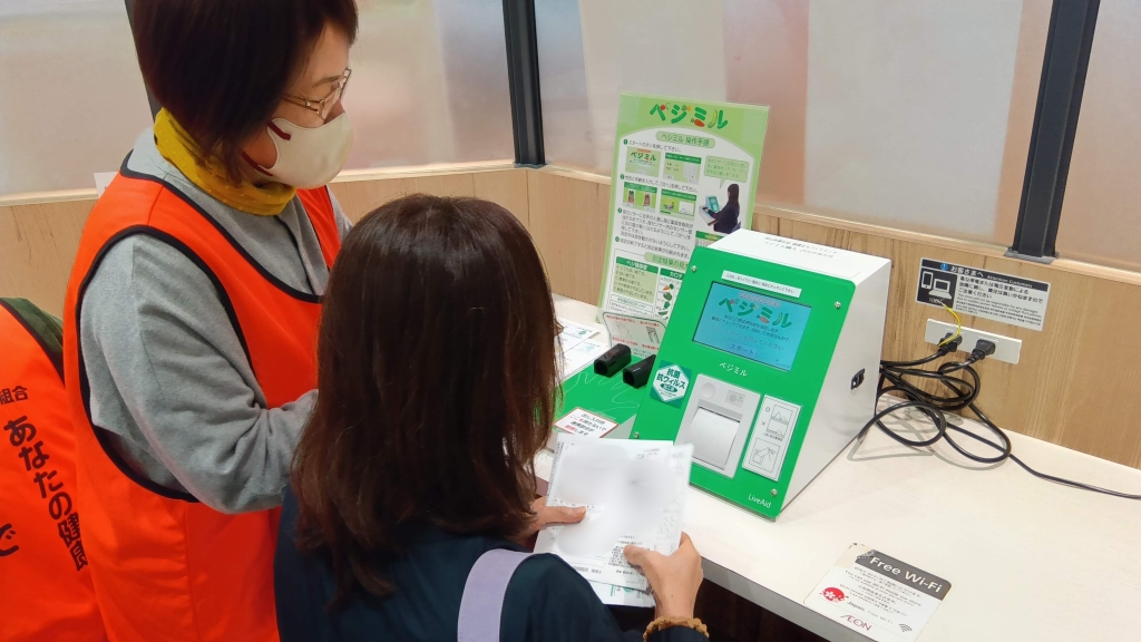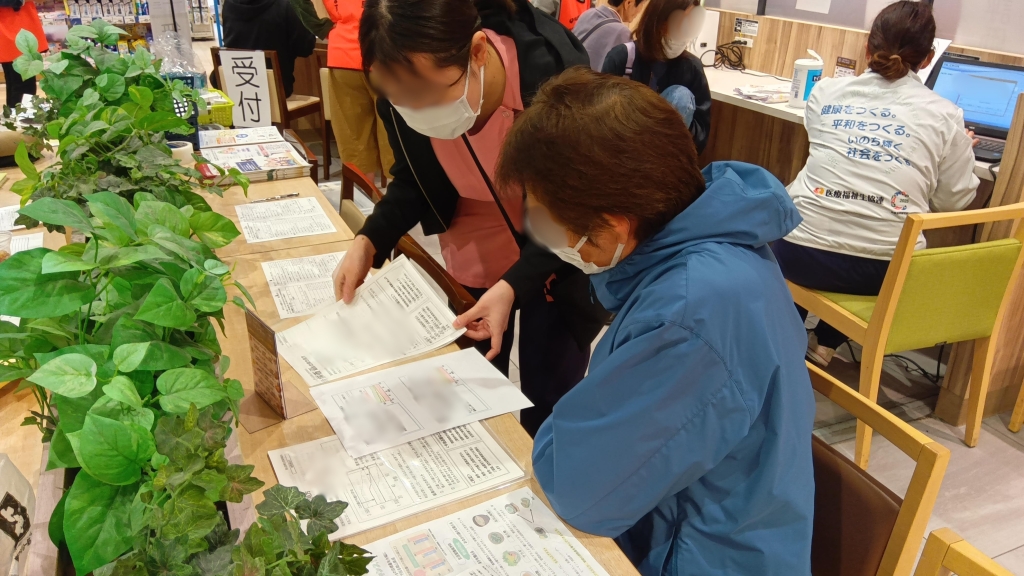 今年は、イオンスタイル青江店のご協力の元、店舗内で健康チェックを開催しました。買い物途中の多くの方に足を止めていただき、ベジミルでの野菜摂取量測定や血圧、フレイルチェック、骨評価の4項目を実施。測定結果を見ながら「もっと野菜を食べなきゃ」「今の運動を続けよう」といった前向きな対話が生まれ、スタッフにとっても非常に励みになりました。数値で現状を知ることは、生活習慣を見直す第一歩です。今後もこうした身近な場所での活動を通じ、笑顔で暮らせる地域づくりに貢献してまいります。