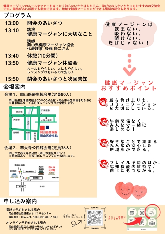 | お問い合わせ先 | 岡山医療生活協同組合 健康まちづくりセンター 電話番号:086-271-7880(電話受付時間:月~金9時~17時) |