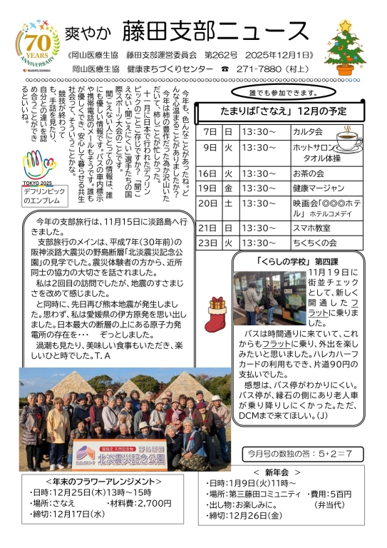 岡山医療生協の南区エリアのイベント案内です。イベント情報は支部のニュースを参照ください。南区藤田のたまりば「さなえ」、サロン活動の一覧を更新しました。地域のみんなで楽しみ、健康づくりにもつながるイベントをこれからも企画します。たまりばさなえ住所:岡山市南区藤田1852岡山医療生協の組合員さんはもちろん、組合員さんではない方も参加可能です。お気軽にお誘いあわせの上ご参加ください。お問い合わせ先:岡山医療生協健康まちづくりセンター/086-271-7880