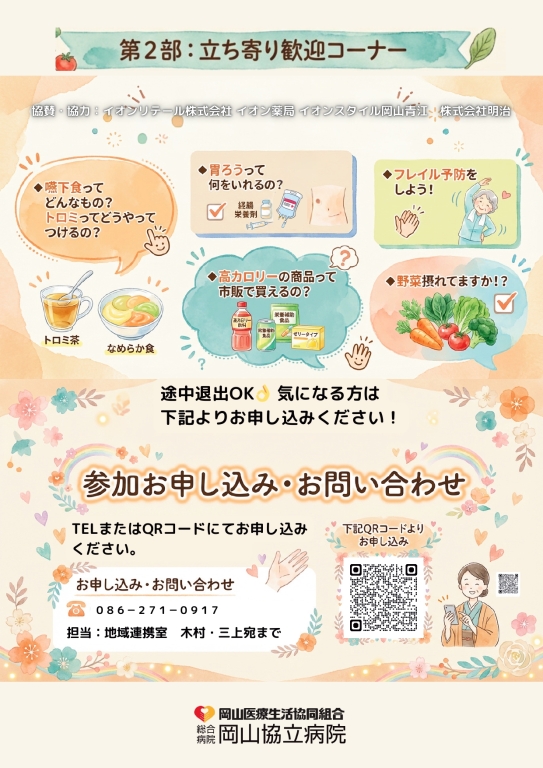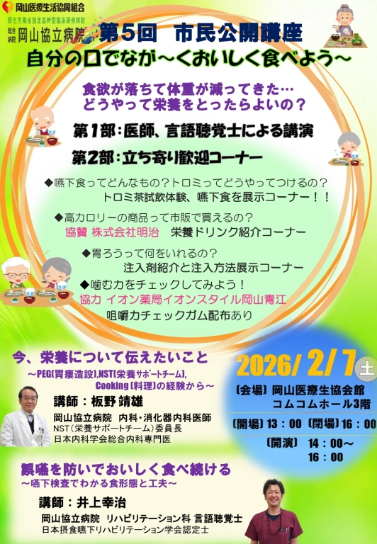 5回目を迎える市民公開講座の案内です。今回は岡山協立病院消化器内科の板野靖雄医師が講師をつとめます。胃瘻造設の話や栄養サポートチームと連携した料理の話まで盛りだくさんです。今回のセミナーでは、みなさんの馴染みの企業や店舗の協賛・協力もあります。ぜひご参加ください。