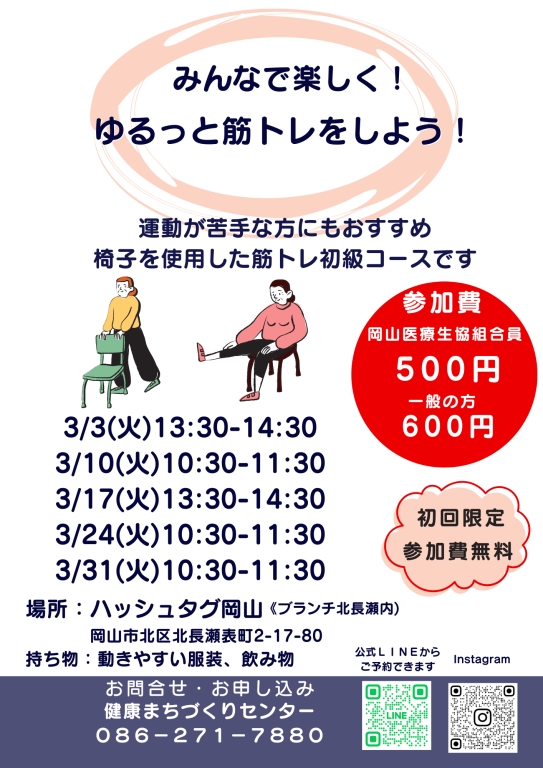 運動初心者にもおすすめの【ゆるっと筋トレ】イベントの詳細はチラシをご参照ください。運動が苦手という方、これから何か始めたいという方におすすめの教室です。座った状態で出来る体操なので、幅広い年代の方にご参加いただけます♪教室に参加希望の方はご予約をお願いします。ご予約は下記連絡先または公式LINEより受付けています。お問い合わせ先:岡山医療生協健康まちづくりセンター/086-271-7880