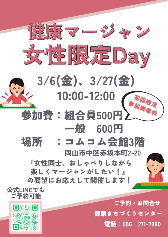 女性だけで【健康マージャン】を楽しみませんか?イベントの詳細はチラシをご参照ください。「マージャンはしたいけど、男性が多いのは…」という方向けに、女性限定の健康マージャンを開催します!組合員サポーターも常駐しているので、お気軽にご参加ください♪脳トレにも効果的な健康マージャンでフレイル予防をしてみませんか?ご予約は下記連絡先または公式LINEより受付けています。お問い合わせ先:岡山医療生協健康まちづくりセンター/086-271-7880