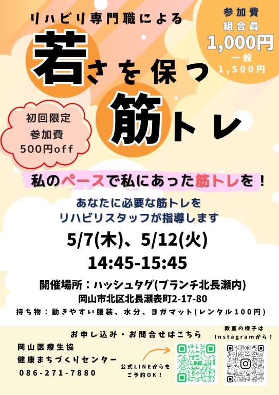 自分にあった運動知りたい方におすすめ!【若さを保つ筋トレ】イベントの詳細はチラシをご参照ください。少人数制の教室です。リハビリ専門職が個別にストレッチや筋トレなどを指導します!自分にあった運動が知りたい方におすすめの教室です。ご予約は下記連絡先または公式LINEより受付けています。お問い合わせ先:岡山医療生協健康まちづくりセンター/086-271-7880