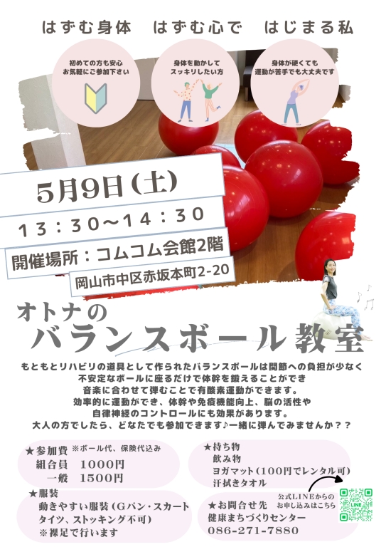 バランスボールで筋トレ+有酸素運動!不安定なバランスボールの上に座るだけで、体幹トレーニングになります。音楽に合わせて弾みながら、楽しく身体を動かしていきます!日頃の運動不足解消に、バランスボール教室はいかがですか?教室に参加希望の方はご予約をお願いします。ご予約は下記連絡先または公式LINEより受付けています。お問い合わせ先:岡山医療生協健康まちづくりセンター/086-271-7880