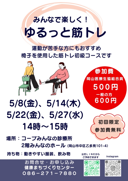 運動初心者にもおすすめの【ゆるっと筋トレ】イベントの詳細はチラシをご参照ください。運動が苦手という方、これから何か始めたいという方におすすめの教室です。座った状態で出来る体操なので、幅広い年代の方にご参加いただけます教室に参加希望の方はご予約をお願いします。ご予約は下記連絡先または公式LINEより受付けています。