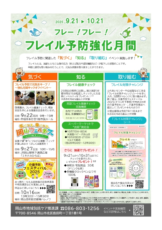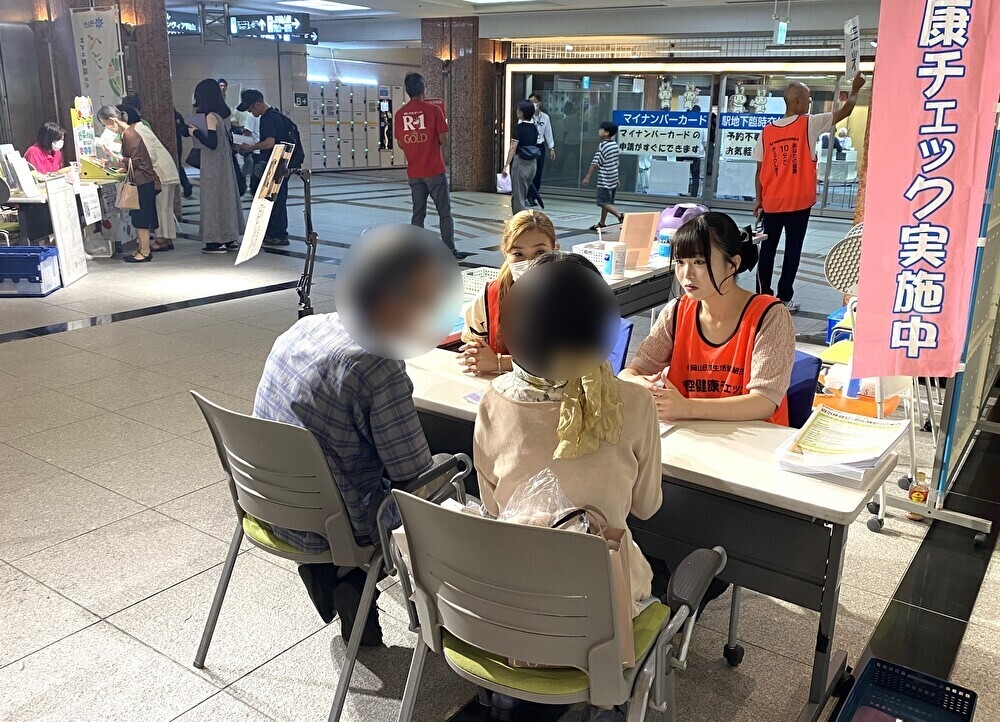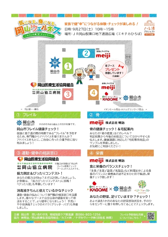 9月27日(土)、岡山市の主催するフレイル予防に関連した「気づく」「知る」「取り組む」イベント、「気になる。身になる。岡山ウエルネス」に参加しました。岡山医療生協・岡山協立病院ブースは、握力ぴったんこコンテストや手洗いおばけ(グリッターバグ)を活用し、専門職による健幸(健康)の相談窓口も設置しました。結果、200名ほど来場されました。ありがとうございます!今回はJR岡山駅地下通路の広場に開催場所が変更され、前年までの改札付近から離れましたが、「チラシをみたよ」「昨年楽しかったからまた来たよ」など声もかけていただき励みになりました。
