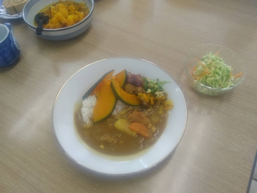 第3火曜日は、クリスマス会を開催しました。クリスマス会食プレートには、ブルーベリークリームチーズやボテト&チキン&キュウリ、ブロッコリー、星形の白身フライやフルーツ等、12人で手分けして1時間程度で出来上がりました。