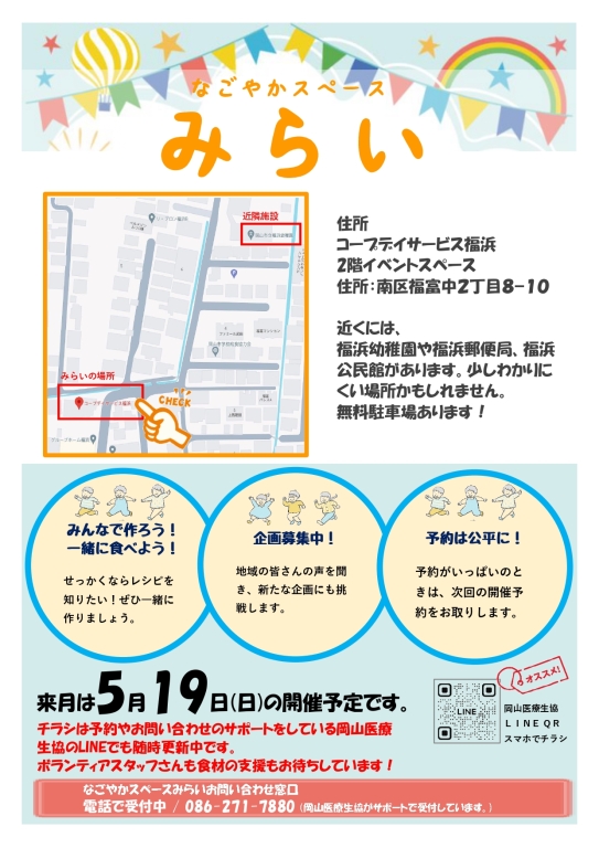 岡山市南区福浜地域の地縁団体(なごやかスペースみらい実行委員会)が運営しています。あたたかく、安心できる居場所がもっと地域にあったらいいなをカタチにした活動です。岡山医療生協は、「みらい」の活動の予約・問い合わせサポートを担当しています。近隣のみなさんぜひお越しください。たまに軒先でバザーもやっていますよ!