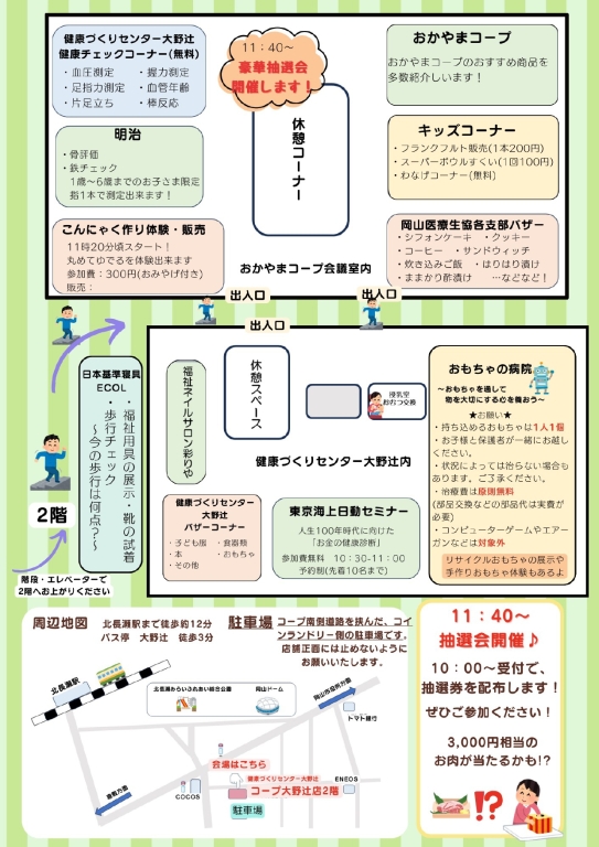 2月15日は健康づくりセンター大野辻へみんなおいでよ!バザー、体験コーナー・キッズコーナー、様々なセミナーも準備しました。おかやまコープの素敵な商品も購入できますよ。盛りだくさんのイベントはチラシをご覧ください。