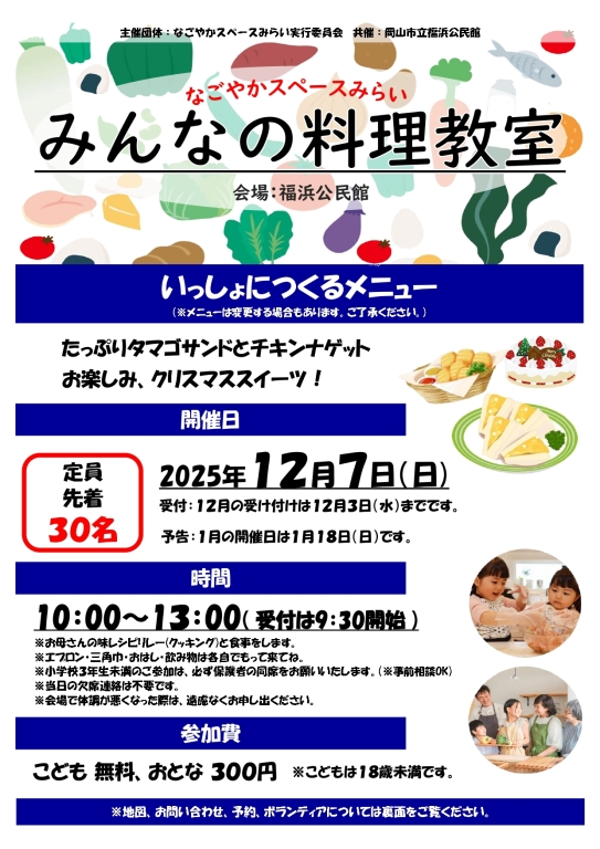 主催のなごやかスペースみらい実行委員会(岡山市南区福浜の地縁団体)と共催の岡山市立福浜公民館、そして地域の企業・団体スポンサーとボランティアで運営しています。みんなが安心して楽しむことのできる居場所がもっと地域にあったらいいなをカタチにしました!近隣のみなさんぜひお越しください。予約は電話でお願いいたします。