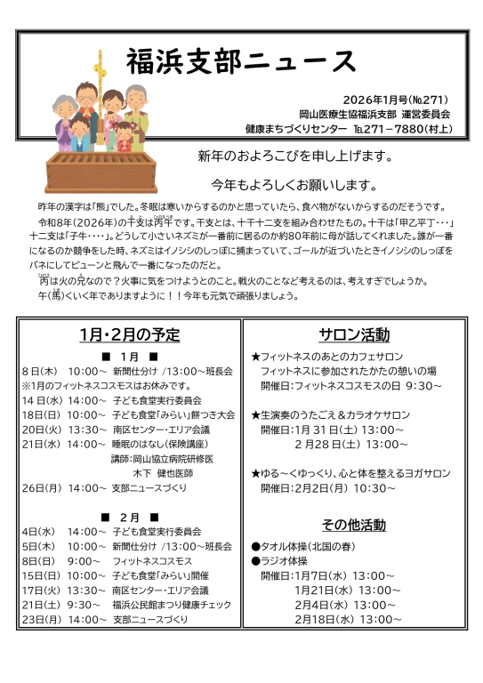 岡山医療生協の南区エリア福浜支部のイベント一覧です。イベントの詳細はチラシを参照ください。地域のみんなで楽しみ、健康づくりにもつながるイベントをこれからも企画します。岡山医療生協の組合員さんはもちろん、組合員さんではない方も参加可能です。お気軽にお誘いあわせの上ご参加ください。お問い合わせ先:岡山医療生協健康まちづくりセンター/086-271-7880