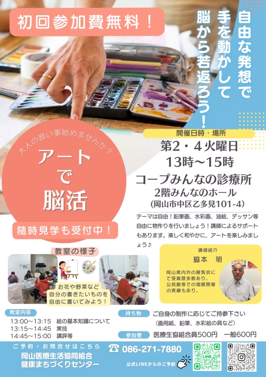 初心者大歓迎!絵を描きながら楽しく脳トレしませんか?自由にテーマを決めて、自分の好きなものを書いてみませんか?鉛筆画や水彩画など、ご自身の好きなものを使って自由に絵を楽しみましょう♪組合員講師がアドバイスを行います!見学もできますので、ぜひ一度お立ち寄りください。教室に参加希望の方はご予約をお願いします。ご予約は下記連絡先または公式LINEより受付けています。お問い合わせ先:岡山医療生協健康まちづくりセンター/086-271-7880