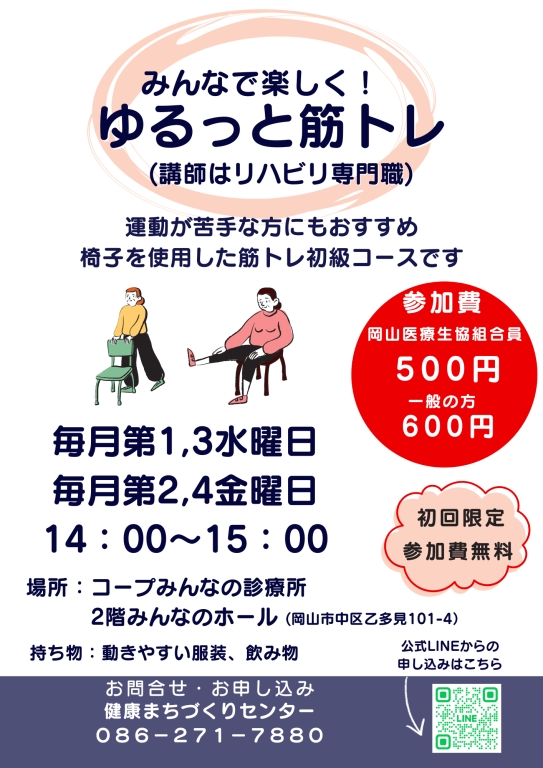 運動初心者にもおすすめの【ゆるっと筋トレ】イベントの詳細はチラシをご参照ください。運動が苦手という方、これから何か始めたいという方におすすめの教室です。座った状態で出来る体操なので、幅広い年代の方にご参加いただけます♪教室に参加希望の方はご予約をお願いします。ご予約は下記連絡先または公式LINEより受付けています。お問い合わせ先:岡山医療生協健康まちづくりセンター/086-271-7880