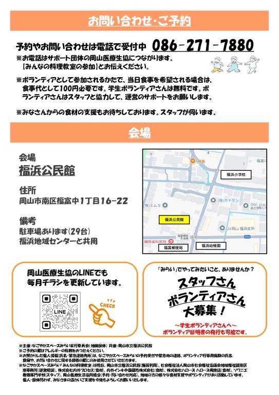 岡山医療生活協同組合 健康まちづくりセンター 電話番号:086-271-7880(電話受付時間:月~金9:00~17:00) ・みんなの料理教室はボランティア行事用保険に加入しております。 ・個人・団体問わず、食材やボランティア支援などよろしくお願いいたします。 ・ボランティア証明書の発行はいつでもご相談ください。 |