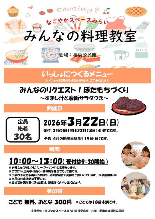 主催のなごやかスペースみらい実行委員会(岡山市南区福浜の地縁団体)と共催の岡山市立福浜公民館、そして地域の企業・団体スポンサーとボランティアで運営しています。みんなが安心して楽しむことのできる居場所がもっと地域にあったらいいなをカタチにしました!近隣のみなさんぜひお越しください。予約は電話でお願いいたします。