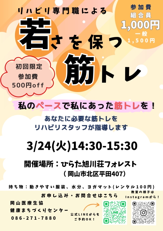 自分にあった運動知りたい方におすすめ!【若さを保つ筋トレ】イベントの詳細はチラシをご参照ください。少人数制の教室です。リハビリ専門職が個別にストレッチや筋トレなどを指導します!自分にあった運動が知りたい方におすすめの教室です。ご予約は下記連絡先または公式LINEより受付けています。
