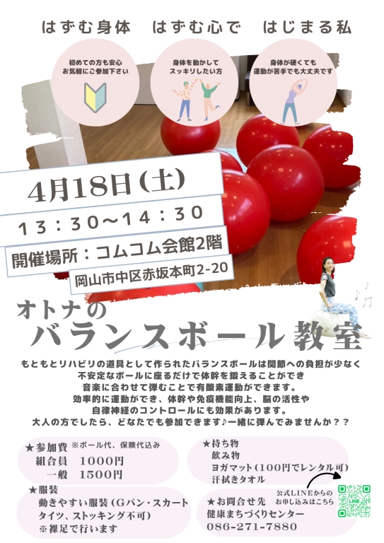 バランスボールで筋トレ+有酸素運動!不安定なバランスボールの上に座るだけで、体幹トレーニングになります。音楽に合わせて弾みながら、楽しく身体を動かしていきます!日頃の運動不足解消に、バランスボール教室はいかがですか?教室に参加希望の方はご予約をお願いします。ご予約は下記連絡先または公式LINEより受付けています。お問い合わせ先:岡山医療生協健康まちづくりセンター/086-271-7880