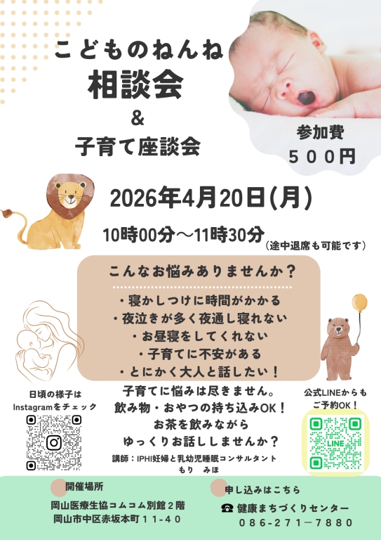 ねんねの悩みは解決出来ます!寝かしつけや夜泣きなど、ねんねのトラブルはありませんか?乳幼児睡眠コンサルタントと一緒に、今のお子さまの状態を見ながら解決策を探してみませんか?とにかく誰かとおしゃべりしたい!というママさんも大歓迎です♪一緒に楽しく交流する時間を過ごしましょう!教室に参加希望の方はご予約をお願いします。ご予約は下記連絡先または公式LINEより受付けています。お問い合わせ先:岡山医療生協健康まちづくりセンター/086-271-7880