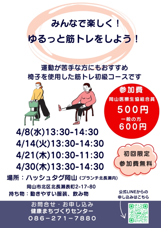 運動初心者にもおすすめの【ゆるっと筋トレ】イベントの詳細はチラシをご参照ください。運動が苦手という方、これから何か始めたいという方におすすめの教室です。座った状態で出来る体操なので、幅広い年代の方にご参加いただけます♪教室に参加希望の方はご予約をお願いします。ご予約は下記連絡先または公式LINEより受付けています。お問い合わせ先:岡山医療生協健康まちづくりセンター/086-271-7880