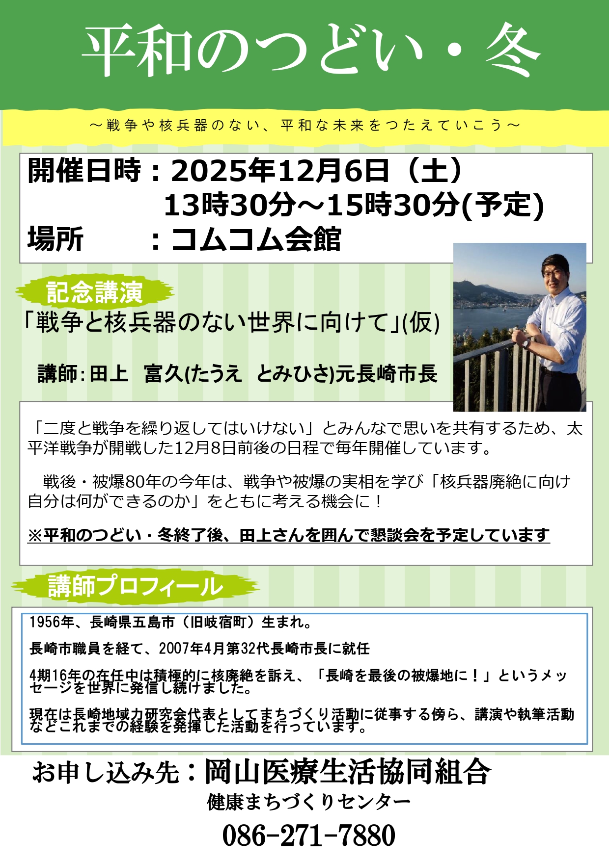 お問い合わせ・お申し込みは、岡山医療生協健康まちづくりセンター(電話:086-271-7880)までお願いいたします。