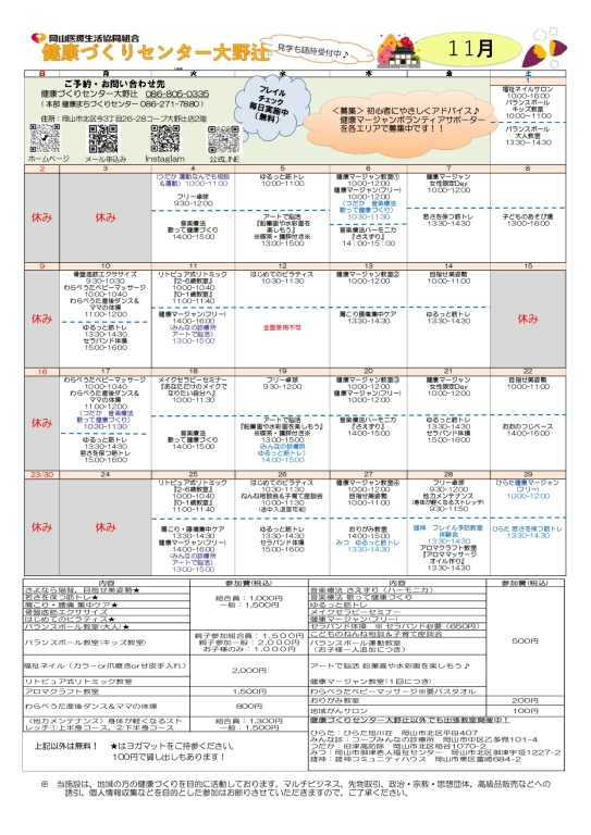 長かった酷暑がようやく終わりかけています。あっという間に冬になりますが、食欲・運動の秋を楽しみましょう!皆さまのご参加、お待ちしております。1月以降の移転開催を踏まえて、一部教室をひらた旭川壮、みんなの診療所でプレ開催します。見学もできますので、お気軽にお越しください。ひらた旭川壮:岡山市北区平田407みんなの診療所:岡山市中区乙多見101−4