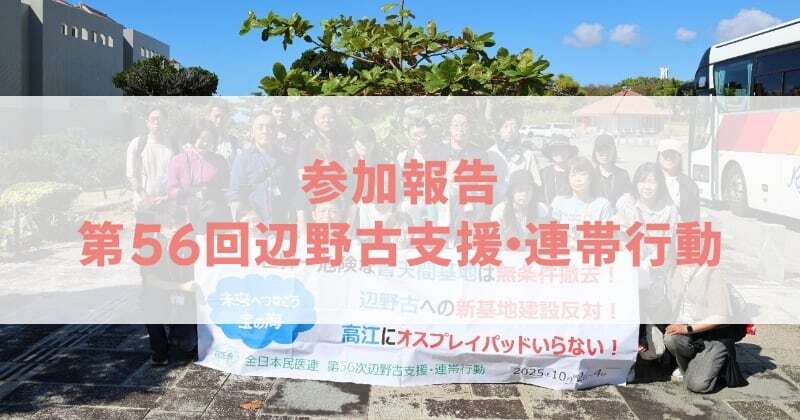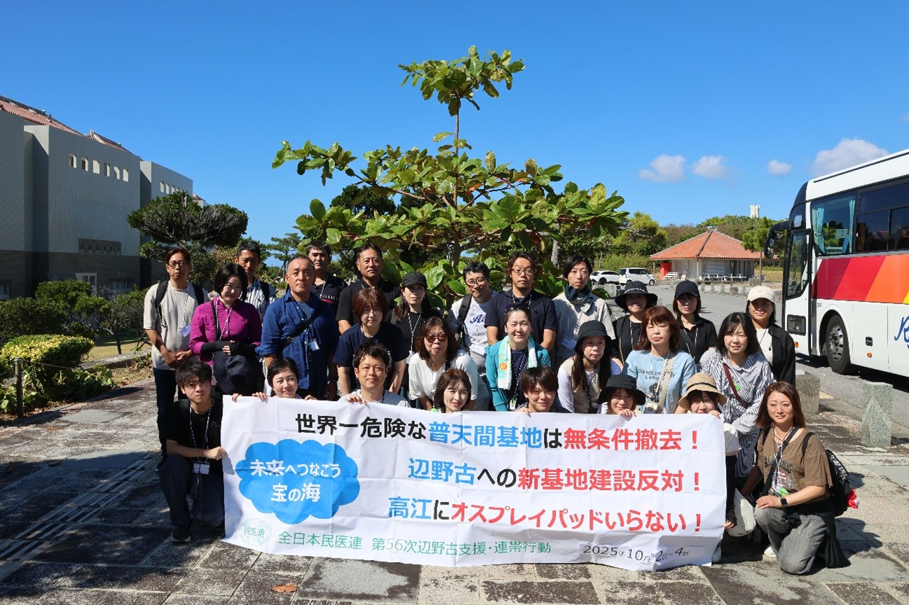岡山医療生協は、2025年10月に開催された「第56回辺野古支援連帯行動」に参加しました。全国からは30人を超える参加者が集まり、現地視察やグループワークによる意見交換を行いました。以下参加者の感想です。
