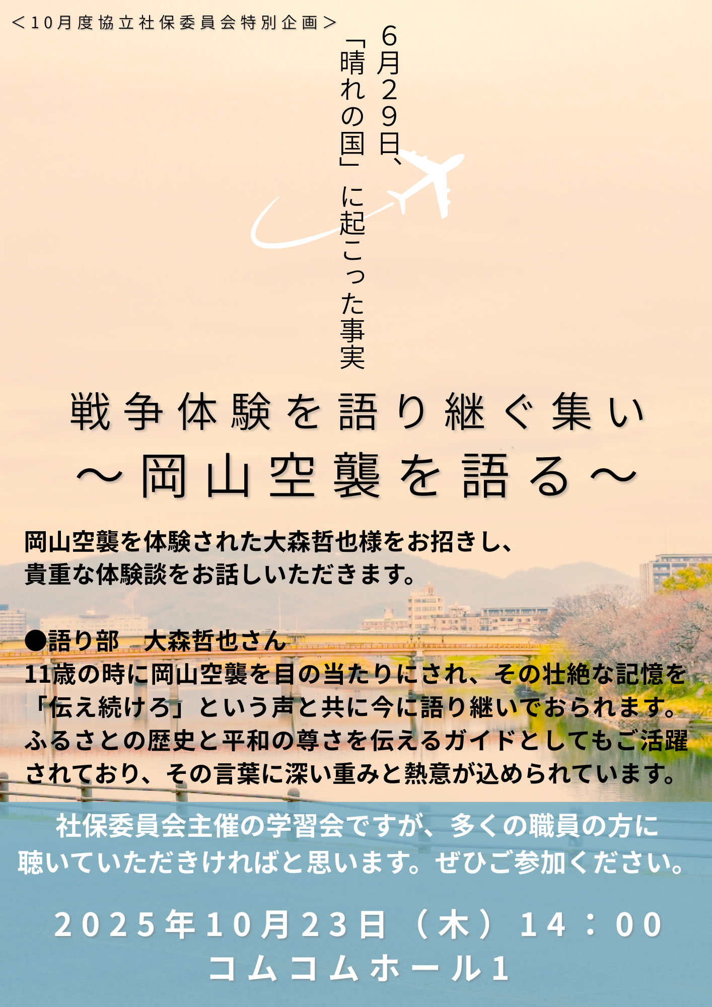 岡山医療生協は、「いのちと心を大切にします」と理念のもと二度と戦争の悲劇を繰り返さないために、いままで様々な平和活動を展開してきました。そして戦後そして被爆80年の節目にあたる2025年に「戦後・被ばく80年平和活動実行委員会」を立ち上げました。この委員会は、平和な時代に生まれ、教育を受け、仕事を選び、家庭を築くことができる現在の恵まれた環境が、どれほど多くの犠牲と祈りの上にあるのかを再認識し、その思いを引き継ぎ、伝えていくためのものです。