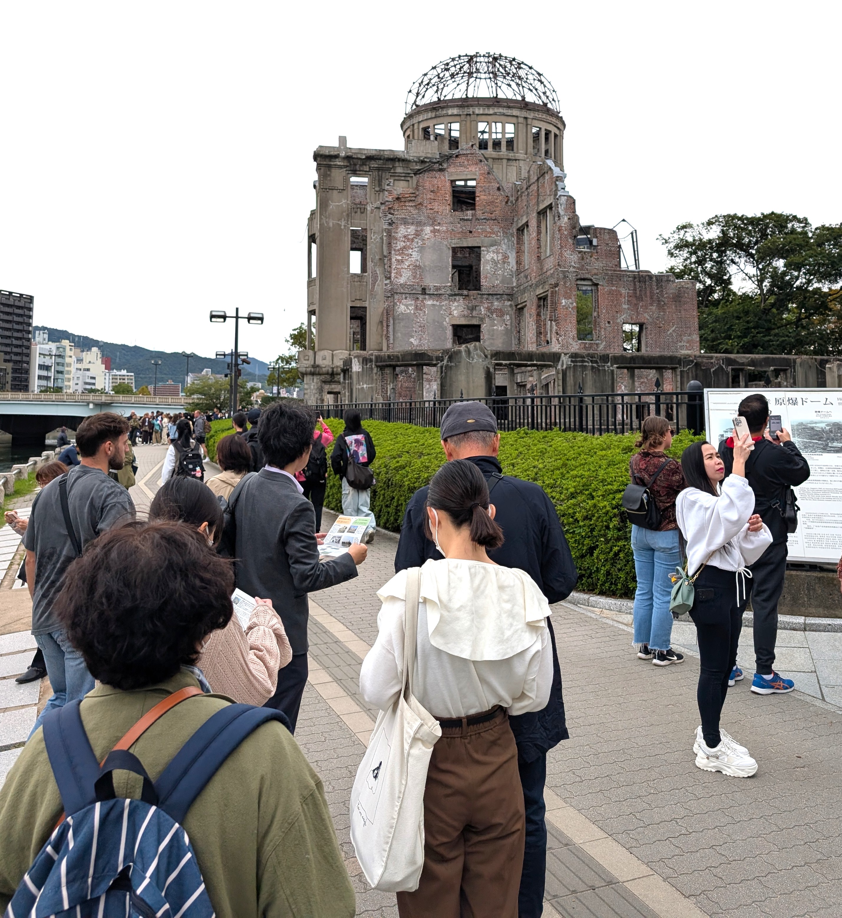 原爆ドームでは、崩れた瓦礫やむき出しの鉄骨から当時の恐怖や苦しみを感じられ、自分がこの場で被害を受けていたらと想像すると胸が締め付けられました。当時、原爆ドームは、平和を求めるシンボルとして残すべきという意見と、被爆の惨事を思い出すため取り壊した方が良いという意見で対立していたそうです。平和を願うとともに、今でも心を痛めている人がいるということも知っておく必要があると感じました。今回の研修を通し、平和の学習とは講演や現場見学、教科書を通して戦争の恐ろしさを学ぶだけでなく、当時の様子を想像し、自分の立場に置き換えて感じることだと知りました。これからも平和を願う気持ちを忘れずにいたいと思います。