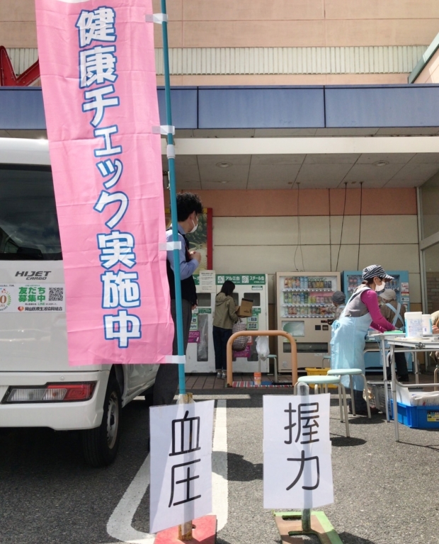 岡山医療生協では地域での活動も活発です。今回は、マルナカ福富店の軒先をお借りした「青空健康チェック」を紹介します。あわただしい日々の中で自分自身の健康状態は後で後でになってしまいますよね。青空健康チェックは、そんな忙しい日々を過ごされている皆さんに、ちょっとの時間で自分の健康状態がチェックできる地域での取り組みです。「あら?血圧が高いな。」「体重増えたなあ。」「体脂肪率や筋肉量率って良く聞くけど、きちんと知ることができて良かったな。」など、新たな気づきもあります。ぜひ、開催されているときはお立ち寄りください。