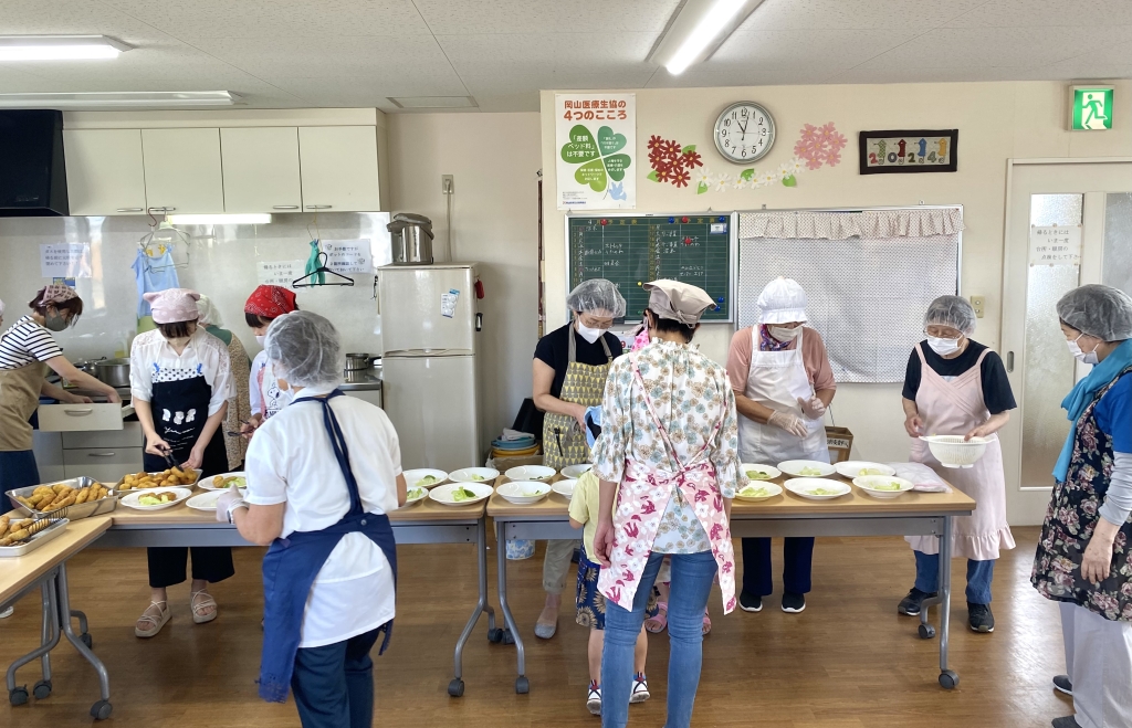 2024年9月15日(日)、地縁団体「なごやかスペースみらい実行委員会」が主催する地域の多世代型こども食堂「なごやかスペースみらい」を開催しました。岡山医療生協は、場所の提供(コープデイサービス福浜)と広報活動で協力をしています。第1部の料理づくり(お母さんの味レシピリレー)では、みんなで3種類のコロッケづくりをしました。ヨーグルトケーキもとっても好評でしたよ!地域のお母さんの味を一緒につくり、一緒に食べてレシピをリレーしています。予約制ですが毎月第3日曜日に開催します。次回は2024年10月20日(日)開催です。みんなで栗ご飯とマリネを作ります、お楽しみに!