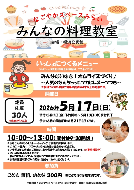 電話:086-271-7880(※みらいのみんなの料理教室参加とお伝えください。)