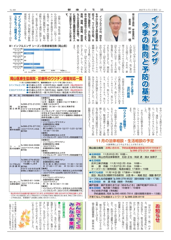 インフルエンザは、例年冬を中心に流行する呼吸器感染症です。ウイルスはA型、B型など複数あり、主に飛沫感染や接触感染で広がります。発熱、頭痛、筋肉痛、倦怠感などの全身症状が特徴で、特に高齢者や基礎疾患のある人では重症化することがあります。11月号の健康と生活は、岡山協立病院呼吸器内科 杉村 悟医師がインフルエンザとワクチン接種の必要性を説明します。詳しくは健康と生活11月号をご覧ください。