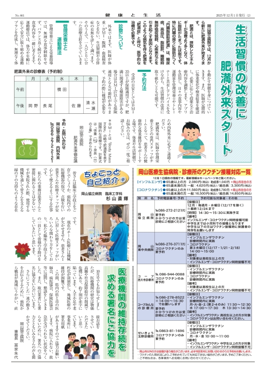 岡山協立病院では、12月から新たに肥満外来が始まります。肥満とは、摂取したエネルギーが消費より多くなり、体に脂肪がたまった状態です。特に内臓の周りに脂肪がつく「内臓脂肪型肥満」は、糖尿病、高血圧、脂肪肝、睡眠時無呼吸症候群、心疾患などを引き起こす原因となります。このような病気を伴う肥満を「肥満症」と呼び、医学的な治療が必要です。12月号の健康と生活は、岡山協立病院肥満外来準備会議から、対象となる患者さん・診察について・今後の予約方法などについて説明します。詳しくは健康と生活12月号をご覧ください。