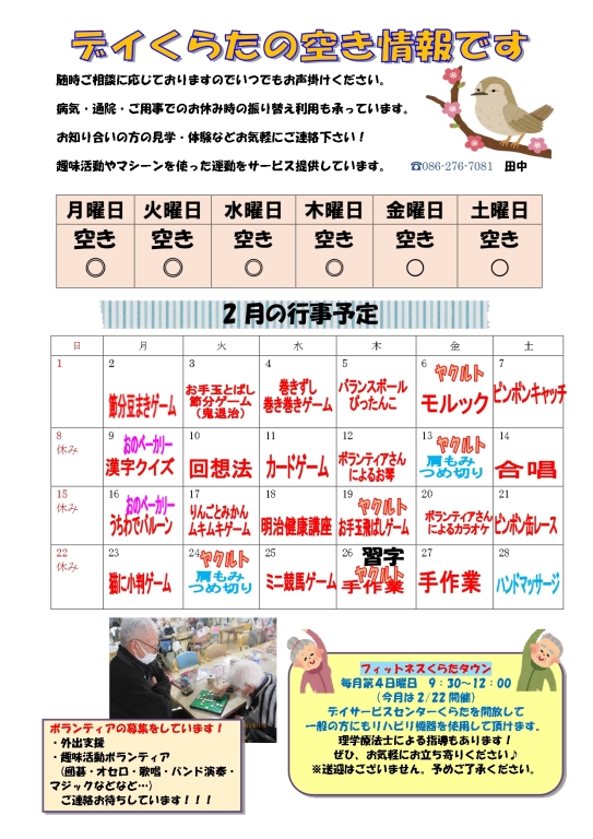 【デイサービスセンターくらた】2月の行事予定